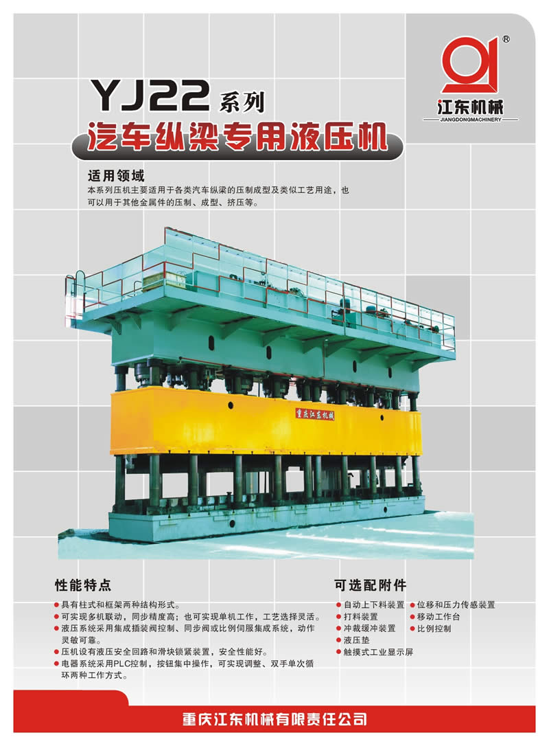 重庆江东机械有限责任公司位于中国目前最年轻的直辖市——重庆市万州区。江东机械最早由国民党军政部兵工署第27厂改制而成,1937年由南京迁入重庆,经过70多年的发展,目前重庆江东机械已成为中国西部规模最大、实力较强的集液压机研发、设计、制造、销售和服务一体的大型装备制造企业。公司占地456亩,拥有标准厂房8万余平方米,员工800多人,各类中高级技术人才150余人,各类专业加工设备200余台(套),具备为用户提供1000KN-100000KN的各种大型、精密液压机及成套生产线的综合能力。目前公司液压机类产品有23个系列,200余种型号,规格从1000kN至100000kN,适用于金属材料的压制、弯曲、翻边、挤压成型及非金属材料如橡胶、塑料、玻璃钢、绝缘材料和磨料制品的压制成型,广泛用于汽车、摩托车、五金、家电、军工、航天、航空、船舶、铁路机车、农用机械、建材、冶金等等行业,并已出口到韩国、日本、印度、巴基斯坦等多个国家和地区。公司为中国机床工具协会锻压机械分会常务理事单位,中国锻压协会会员单位,重庆市高新技术企业;液压机为重庆市名牌产品,江东机械为重庆市著名商标。