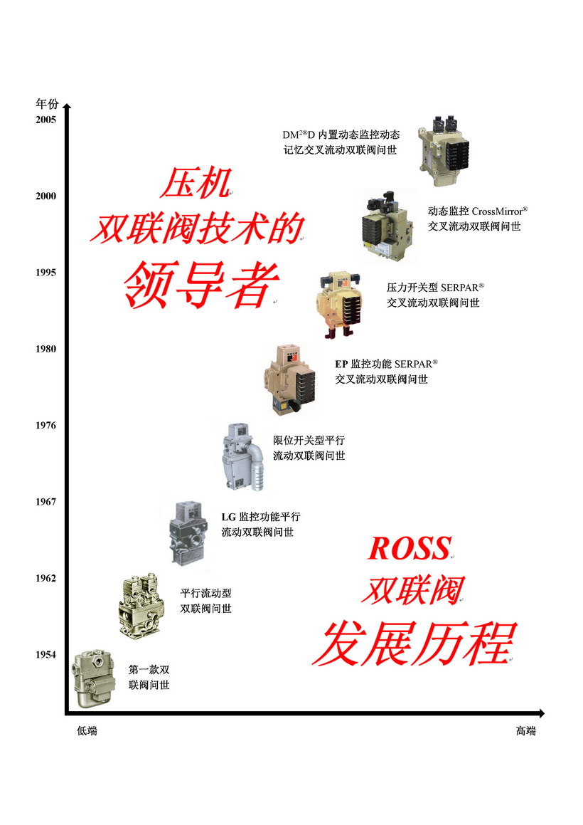 ROSS CONTROLS在气动安全阀门领域享有极高的声誉。上海卢斯气动元件有限公司是ROSS CONTROLS在中国的子公司,成立于2005年,全面负责ROSS CONTROLS在中国地区的一切事务。 ROSS气动阀门品种达到5000多种,包括电磁控制阀、空气控制阀、手动阀、双联阀等等,全面应用于多种工业领域,如钢铁、锻压、玻璃制瓶、原铝制造等。ROSS在气动阀门的设计研究开发方面也一直处于世界先进行列,90多年来在空气控制技术上做出了巨大的革新,作为ROSS代表性产品的双联阀,更是被不断完善、推陈出新,以求为用户提供最为安全优质的服务。