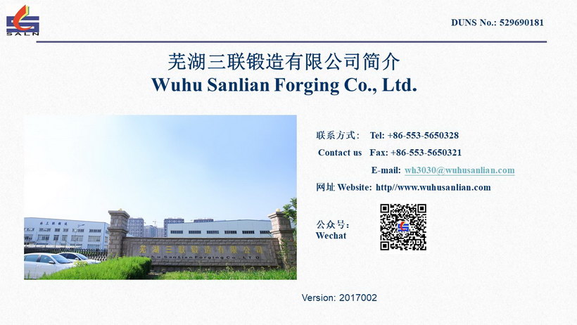 芜湖三联锻造有限公司位于安徽省芜湖市高新技术开发区内。是一家专业从事汽车零件锻造及机加工的民营企业,三联公司总占地面积110亩,总投资2亿元人民币。锻造生产线20条,年生产锻件4万吨。