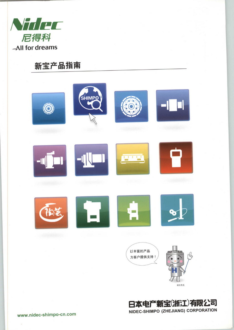 日本电产新宝株式会社是日本较早生产减速机、变速机的日资企业,为日本电产集团其中一员。2004年在中国浙江正式成立中国工场――日本电产新宝(浙江)有限公司。公司占地50000平方米,现有员工1300人左右。我公司的减速机品牌在中国主要是ABLE、可乐利。主要配套日系伺服电机(三菱电机、松下电机、安川、富士等各类日系伺服)进行使用。目前公司产品在日本的伺服电机配套用减速机市场保持着较高的占有率。目前中国国内的客户群也已经扩大并进行贩卖。我公司产品具有高精度、高静音、低成本三大优势,可用于机械手、商标印刷机、弹簧机械、切割机等各行业。