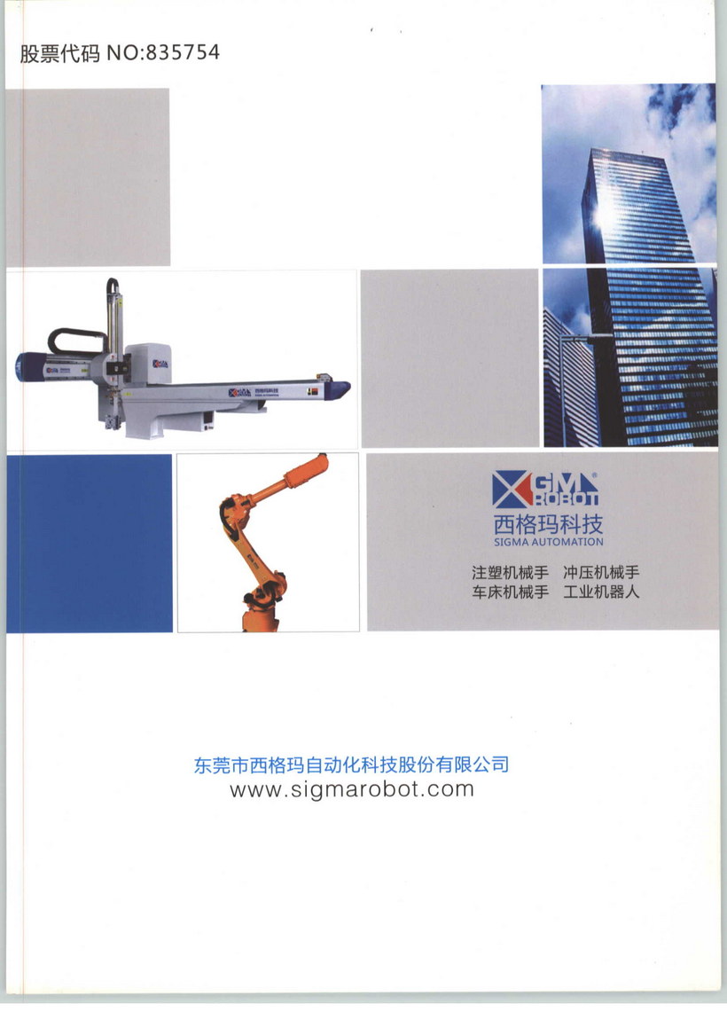 东莞市西格玛自动化科技股份有限公司为致力于射出成型注塑机之专用机械手臂的研发、生产、销售及服务的高新技术产业。 产品内容包括:全伺服式机械手、横走式机械手、纵走式机械手、斜臂式机械手、立式注塑机专用机械手等十大系列机械手,可搭配15吨到4000吨的各型射出成型注塑机,为您量身打造最佳自动化解决方案;产品广泛应用于:家电业、计算机及周边产业、光电业、化妆品包装、汽车及其零部件、事物机器零件业、精密齿轮业、PET瓶胚业、家庭日用品业、手机通讯业、医疗用品业、食品包装业……等等。