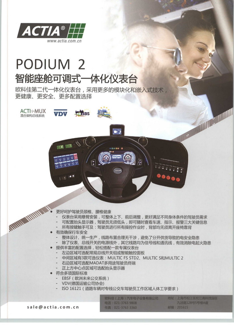 欧科佳(上海)汽车电子设备有限公司成立于2003年,是法国欧科佳集团(ACTIA Automotive)在中国的独资子公司,为商用车、乘用车、非道路机械提供车载电子设备与架构系统,以及汽车电子检测与诊断设备及软件系统,是宇通、厦门金旅、厦门金龙、苏州金龙、中通、安凯、亚星、申沃、宝马、奔驰、大众、沃尔沃、PSA、东风、长安、广汽、华晨、三一重工、徐工、博雷顿、星光农机等国内外众多主机厂的首选或标配供应商。欧科佳的产品与方案采用国内、国际领先的技术,质量可靠稳定,具有良好的兼容性、扩展性,满足国内、国际相关标准,海外高端市场占有率高。自成立以来,欧科佳中国一直致力于引介全球前沿技术,推动行业新发展。2004年,率先将CAN总线技术引入中国客车市场并推广。2009年、2012年,举办第一届和第二届汽车故障诊断技术及发展国际研讨会。2013年,在国内推广应用DMT车载智能信息系统解决方案并率先开始在行业介绍EBSF Project欧洲未来公交系统。DMT车载智能信息系统解决方案全面整合了CAN总线、故障诊断、维保专家系统、车联网技术、车队管理系统。2017年,开始在客车行业介绍欧洲ITxPT标准。2019年,发布欧科佳新一代智能网联架构ITxPT,举办第三届汽车故障诊断技术及发展国际研讨会。2021年,发布欧科佳客车电子信息及控制系统集成方案。2023年,发布欧科佳车辆网络安全解决方案。