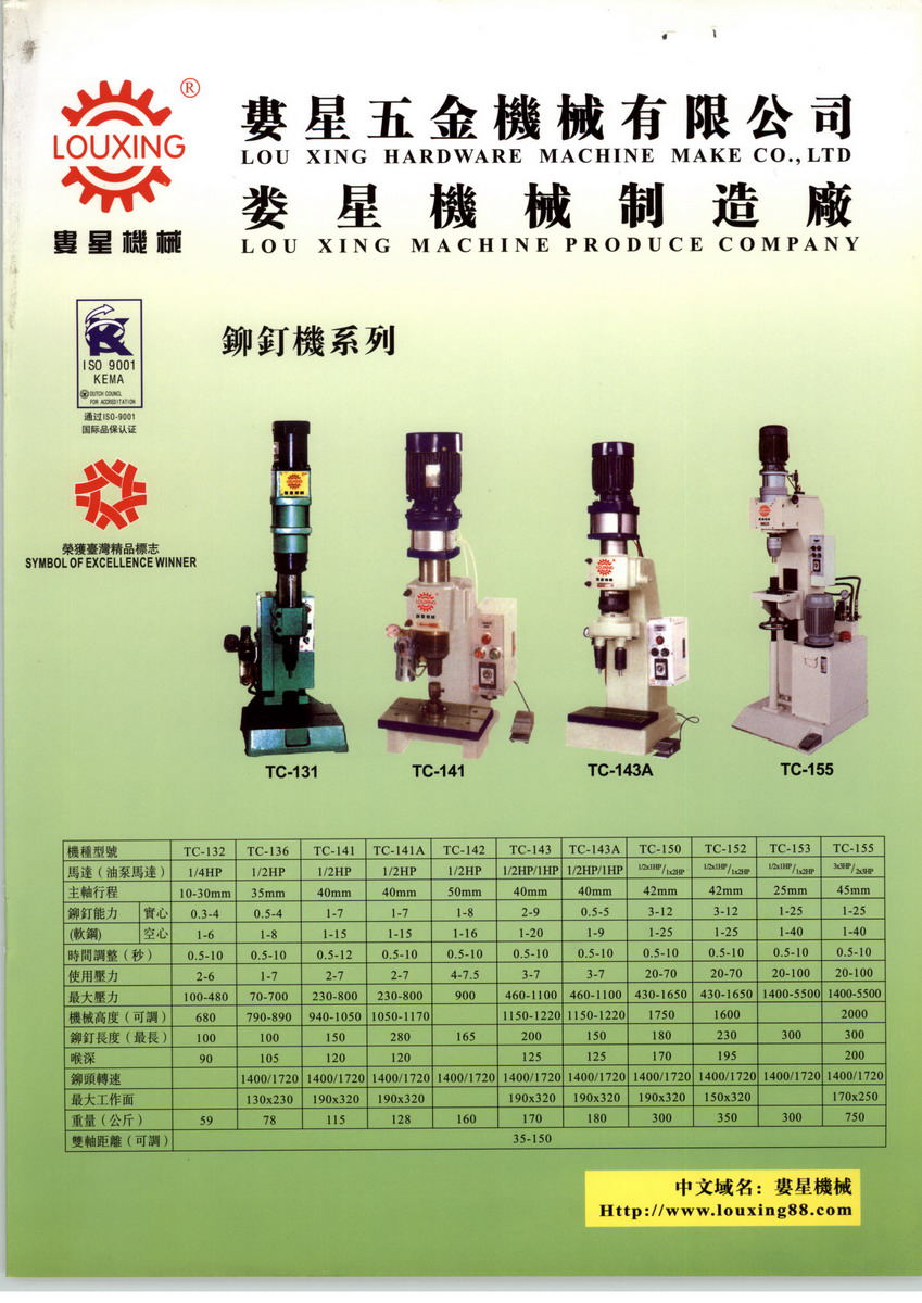 东莞市娄星五金机械有限公司,台湾成立于1976年;大陆东莞成立于2000年;江苏昆山成立于2003年。是集设计,开发,制造,销售于一体的机械生产厂家。并以引进日本、台湾等先进技术及电子元件,开发及制造:攻牙机、铆钉机、钻孔机、刀具设定仪、齿轮式攻牙机、多轴钻孔攻牙器、空油压铆钉机、撞钉机、高速钻孔机、磁性钻孔攻牙机、非标专用机械、冲床周边机械设备等。所生产的机械广泛适用于汽车、摩托车、单车、压铸、五金、电子、灯饰、运动器材、沙滩椅、烧烤炉等行业。配合生产的实心钉,中空钉品种齐全, 品质保证。深受广大用户好评,产品广销日本、台湾、东南亚及国内各省!