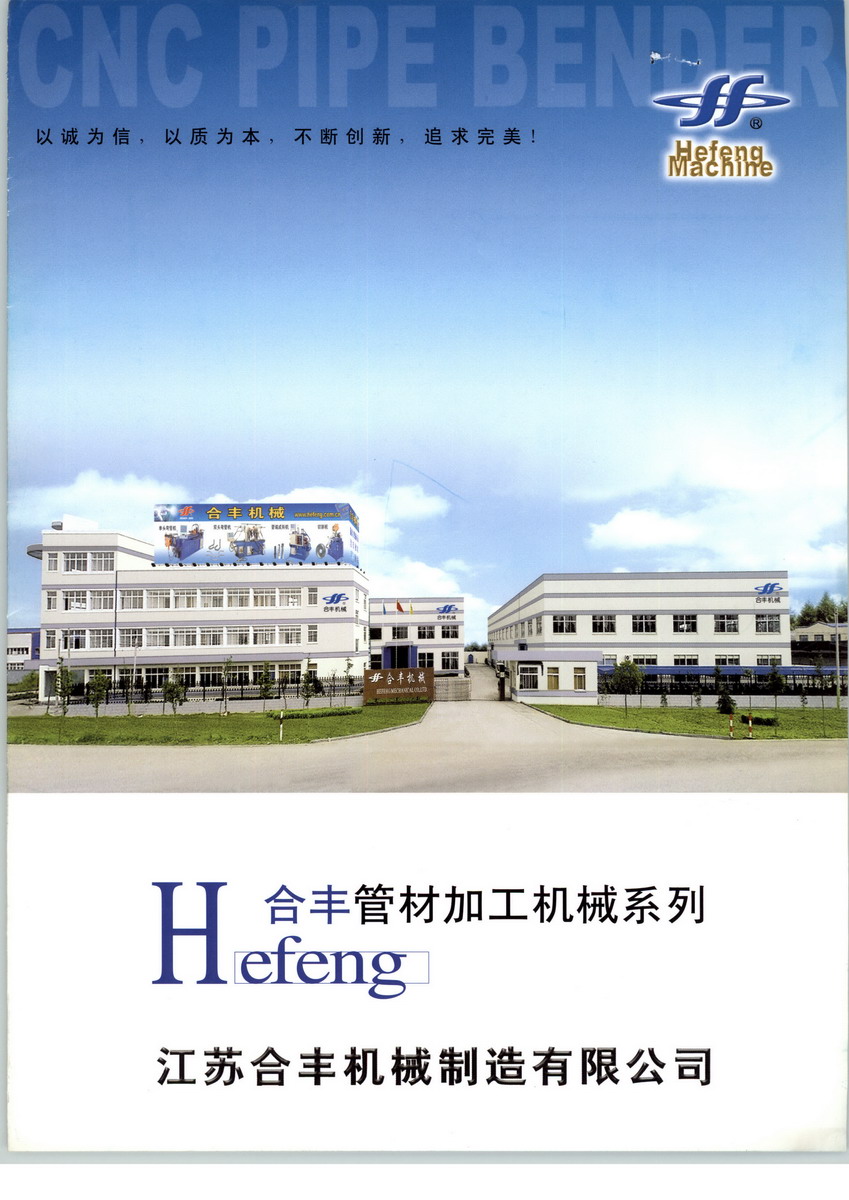 江苏合丰机械制造有限公司始建于1985年,位于204国道边,交通极为便利,占地面积2.5万平方米,是管材加工机械的专业生产基地,并通过了ISO9001:2000质量管理体系认证,全部产品具有出口许可证. 公司具备雄厚的设计开发能力,拥有高精密的生产检测设备,在多年生产基础上,精益求精,不断改进创新,先后研制开发了微电脑控制DW、SW等系列弯管机、SG系列管端成型机、YJ系列金属圆据机、铆接机、磨齿机等自动化管材加工机械。为汽车、摩托车、电动车、体育健身器材、钢管家具、旅游休闲用品、水暖卫浴,空调制冷、换热、造船等行业的金属管类制品的加工提供了成套、完美的机械设备. 公司在全国形成了售前、售后规范化的营销服务网络,为新老客户提供优质、快捷的服务。公司遵循“科技为先导,质量为中心,客户满意为目标”的宗旨,以精诚合作的态度和广大用户共同创造辉煌灿烂的明天!