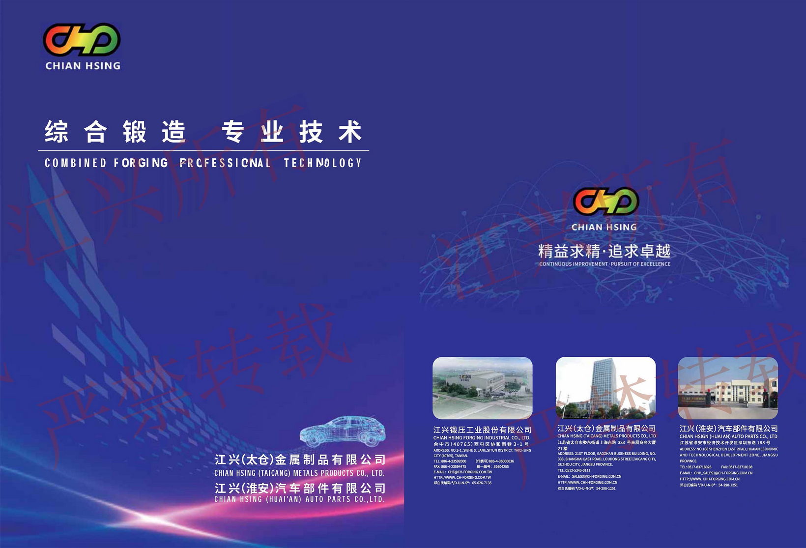 江兴锻压工业股份有限公司自西元1971年创立以来,秉持著「顾客满意、同仁乐意、经营得意、永续经营」之经营理念,不断开发综合锻造之技术,使本公司所生产的锻品更优良、更精密、更能减少切削加工,使锻品更臻于理想。于1997年在江苏省太仓市设立江兴(太仓)金属制品有限公司,以及2012年设立江兴(淮安)汽车部件有限公司,延续台湾总部的经营理念和专业技能,持续在国内发展并精进冷温热综合锻造技术。