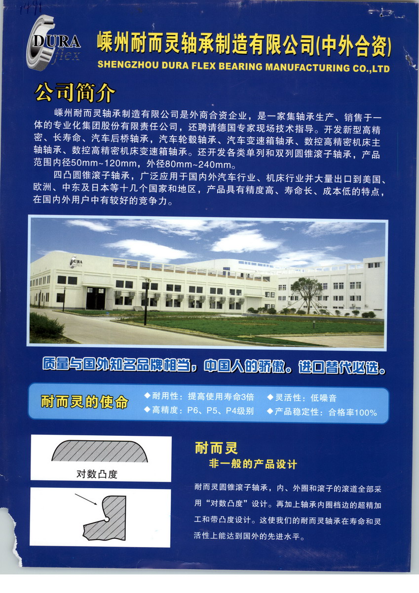 嵊州耐而灵轴承制造有限公司坐落在美丽富饶的沿海开放城市浙江省嵊州市,东距宁波大港50公里,西邻杭州125公里。本公司属外商合资企业,是一家集轴承生产、销售于一体的专业化集团股份有限责任公司。公司与洛阳轴承研究所成产联合研发中心并聘请德国专家现场技术指导,开发新型高精密、长寿命汽车后桥轴承、汽车轮毂轴承、汽车变速箱轴承、数控高精密机床主轴轴承、数控高精密机床变速箱轴承,填补了国内四凸圆锥滚子轴承的空白。