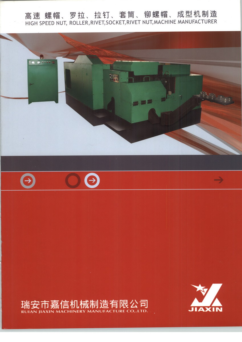 我公司引进国外先进技术生产制造五模、六模、加长、轴承式高速螺母、台湾式五模六模螺母冷镦机、零件、多工位成型机、冷镦机,具有结构紧凑及刚性高,操作、维护方便等特点。使用本设备能简化生产工艺,提高工效,材料利用率高,精度高,强度好,企业经济效益显著。