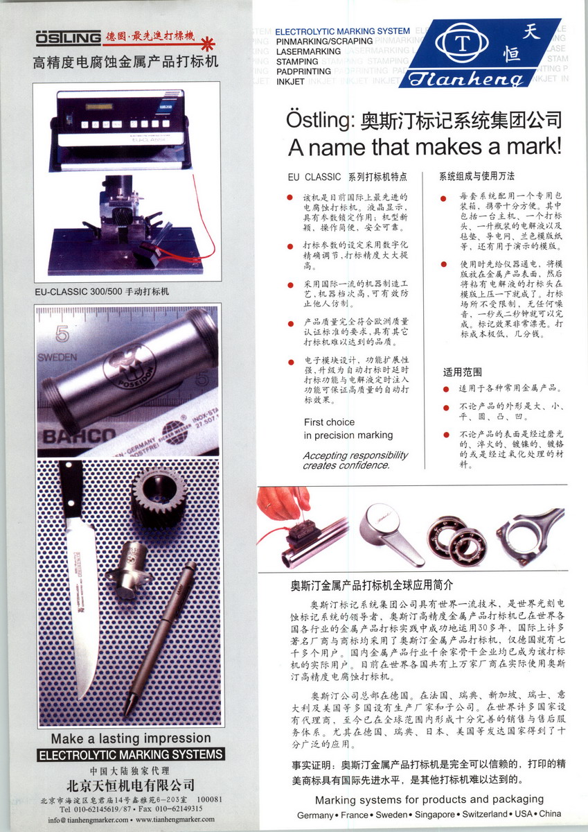 北京天恒标记系统有限公司(简称北京天恒标记公司)主要是从事激光产品及激光设备的研发、生产、销售、服务为一体的高新技术企业。公司研发实力雄厚,采用先进的激光技术,以中科院、清华、北大、北理工等科学院所为依托,自主研发并生产的激光打码机等系列产品。公司运用现代化企业管理模式,拥有一流的管理人才和资深技术人才(专业技术人员占员工总数的80%,其中中高级技术人员占40%)。公司以灵活、高效的市场运作机制,是国内激光在线飞行标刻行业中最具有核心竞争优势的公司之一,也是国内最早生产激光打码机的企业。北京中侨公司以“踏实、稳健、创新”的精神面向全国市场及广大用户,提供最新、最全面、最贴心的技术服务来打造激光打码机“中侨激光”品牌。 公司坚持以市场为导向,以科技为先驱,以不断开拓进取的精神,努力创造知识经济的良好运作模式,倡导“以人为本,共同创业”的企业精神,推行“精雕细琢,追求完美”的品质方针,以不断开拓进取的姿态迎接新的未来。 中侨公司的发展历程是立足北京,辐射全国,以激光在线式飞行标刻业务为基础,大力发展各类激光应用技术。公司生产的在线飞行激光打码机的优势在于飞行打标速度快,标刻清晰、字形美观、工作稳定、体积小、打标精度高、无环境污染、整机可靠性高等优点,特别适用于自动化生产线和单台使用,还可在平面、弧面、圆柱体和运动工件上打标。广泛应用于烟草、食品、药品、饮料、酿酒、汽车零部件以及钢制品等行业的包装线或表面上,并可为用户提供防串货、防伪的全面解决方案。