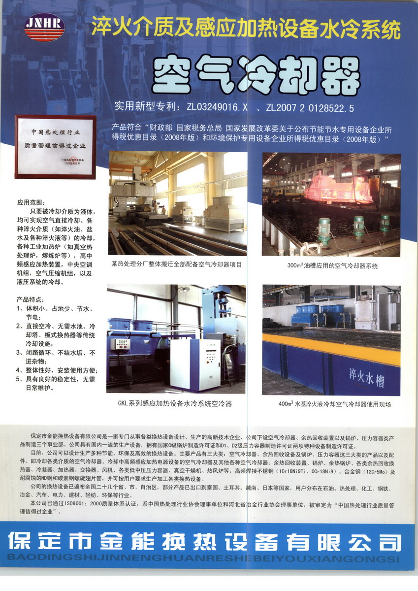 保定市金能换热设备有限公司是由原保定市机械电器研究所改制组建而成。经过多年奋斗,已发展成为一家专门从事各类换热设备设计、生产的高新技术企业。公司下设空气冷却器、余热回收装置以及锅炉压力容器类产品制造三个事业部。公司拥有一支经验丰富的从事换热节能和机电设备设计的专家队伍,其中高级职称人员8 名,中级职称人员16名,同时长期聘请北京、天津地区大学教授及科研单位专家12名作为技术顾问,同时招收了一批近年毕业的大学毕业生并长期聘用,形成了一支新老结合,校企结合,具备雄厚技术实力的研发队伍。经过多年努力,公司取得了大量的科研成果,获得了多项省部级科技进步奖和节能奖,有多篇学术论文发表在国内期刊和全国热管会议上,公司具有完善的生产设施和过硬的生产队伍。