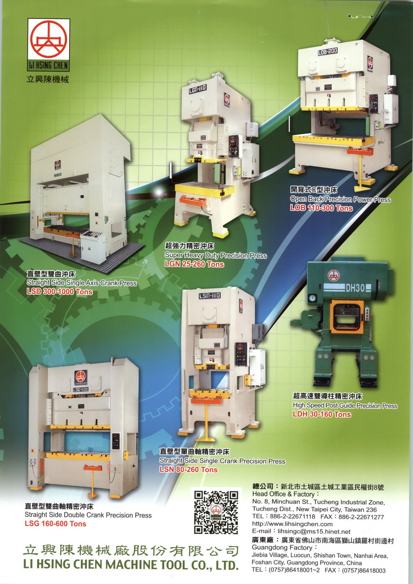 「品质创新丶追求卓越」是立兴陈重要的企业理念之一,以提供满足客户之优良产品并致立於周边自动化的研发及配合。立兴陈冲床产品包含直壁型双曲冲床丶直壁型单曲冲床丶直壁型双曲轴精密冲床丶开背式C型冲床丶超强力精密冲床丶超高速双导柱精密冲床丶气压式高速精密冲床,产品品质优异,兼具高效率丶高安全的特性,是您迈向成功的最佳夥伴。