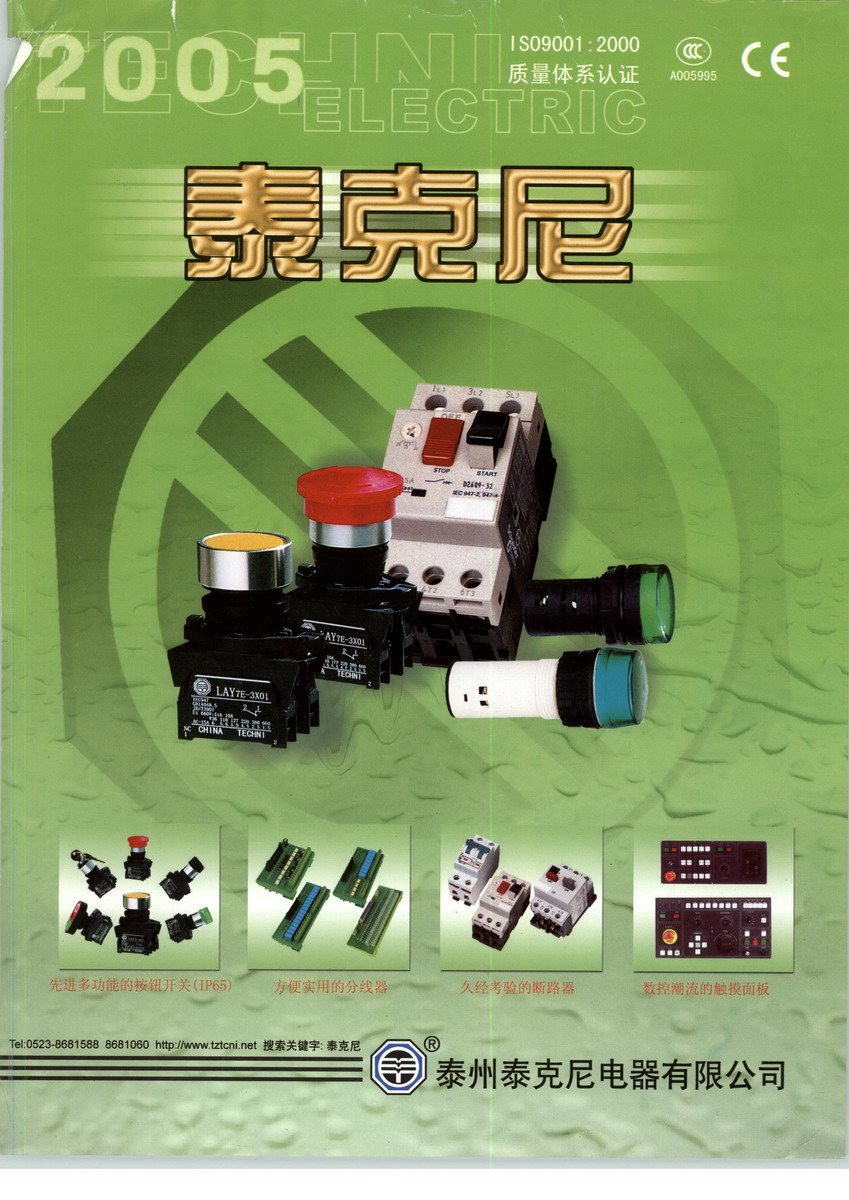 泰州泰克尼电器有限公司是香港哥罗集团在大陆投资的一家独资企业。公司成立于1992年,是国内率先消化吸收国外先进技术,专业生产低压电器产品厂家。目前生产的主要产品有:LAY7系列、LA117系列按钮开关、DZ163小型断路器系列、DZ163L漏电断路器、TA86系列墙壁开关,以及动力、照明配电箱等六大类产品。