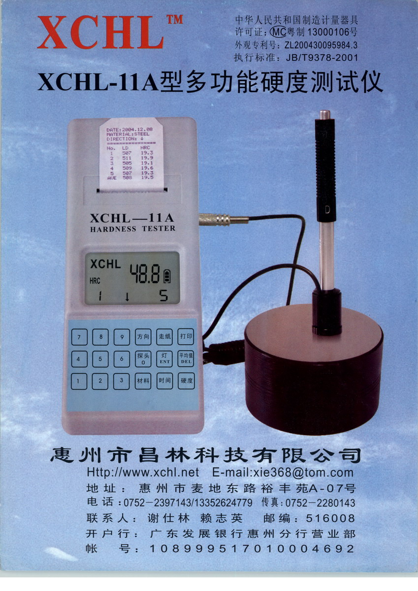 本公司专业生产多功能里氏硬度计,有三种型号可选择  XCHL-11A、XCHL-11B、XCHL-11C型里氏硬度计技术先进、质量可靠、操作简单、使用方便。是适用于模具、机械、机床、锻造、五金、热处理、特种钢等行业理想的硬度测试仪器。 质量可靠、操作简单、使用方便。是适用于模具、机械、机床、锻造、五金、热处理、特种钢等行业理想的硬度测试仪器。