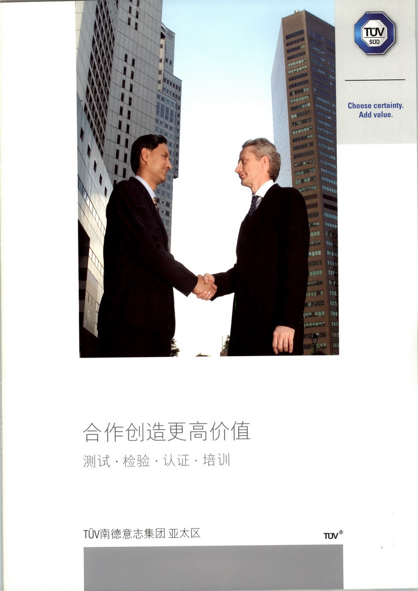 的服务及领先的德国技术享誉全球。服务范围覆盖认证、测试、检验、资讯及专家指导等多个领域。公司目前分布于全球800多处及拥有遍布全球的实验室网络,员工约20, 000人。着力为客户提供技术、体系及实际生产过程中的优化服务。2013年,TüV南德意志集团营业额约20亿欧元。