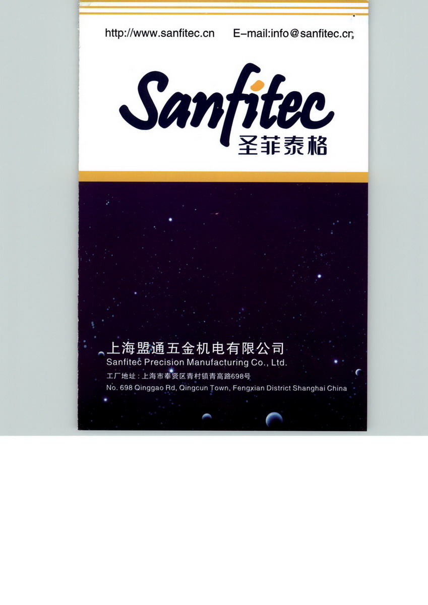 上海盟通五金机电有限公司是一家技工贸一体化的综合性企业。公司成立于2002年,工厂现位于上海市奉贤区。2006创立品牌"Sanfitec 圣菲泰格",多年来一直注重产品质量,致力于建立品牌产品。生产设备有冲床、折弯机, 车床、磨床、焊接机,注塑机 。检验设备有投影仪,硬度仪,膜厚仪,盐雾测试仪等。 公司多年来一直致力于冲压件、钣金件、机加件、焊接件、水暖安装工具、塑料件的生产,经验丰富。此外厂内还拥有模具车间,进行模具的设计和制造。除了来图、来样加工外,还可以供产品装配、开发设计、质检等各项服务。工厂周边有完善的热处理、表面处理等配套工厂。交通便利,距离上海港及机场很近,大大节约运输物流成本。 公司客户主要遍及美国、加拿大、德国、法国、意大利、西班牙、荷兰等欧美发达国家。公司不仅与国外制造商,分销商,佣金商合作,还拥有与国外公司在华办事处及采购商合作的丰富经验。 公司以质量为本,遵循 “ 尊重、创新、敬业、共赢”的企业文化,秉承“客户至上,服务为本,质量第一”的经营理念。上海盟通五金机电有限公司将致力于成为您首选的工业零配件的合作伙伴!