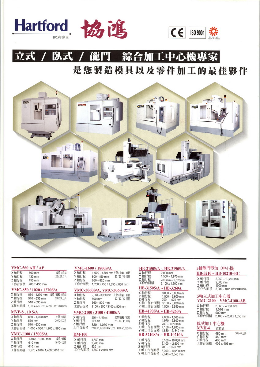 台湾协鸿工业股份有限公司成立于1965年,公司位于台湾省台中市。创业45年以来,协鸿公司发展迅速,目前已成为台湾最大的加工中心机专业制造厂,包含四个分厂,五百名员工,占地面积72500平方米,年产量2000台以上。