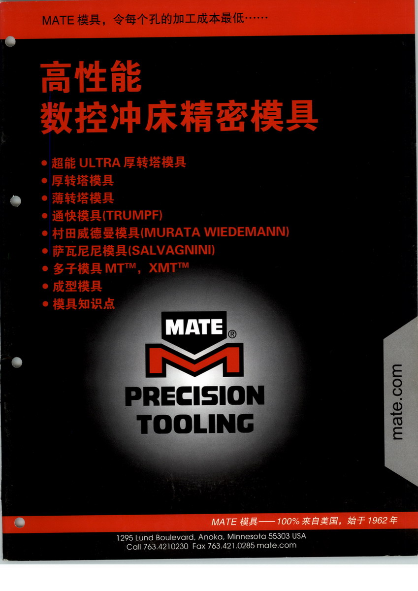 Mate Precision Tooling始建于1962年,总部位于美国明尼苏达州的阿诺卡市,是一家为Amada, Euromac, LVD-Strippit, Murata Wiedemann, PrimaPower and Trumpf机床生产商提供原厂新机包和数控冲床模具备件的领先制造商。全球目前拥有两个制造基地,分别位于美国和德国。在过去的五十年里,MATE已经在产品的品质,价格,交期和服务上占据了行业领导地位。美特的产品和服务的理念只有一样,那就是帮助客户生产出能更有效和优质产品。