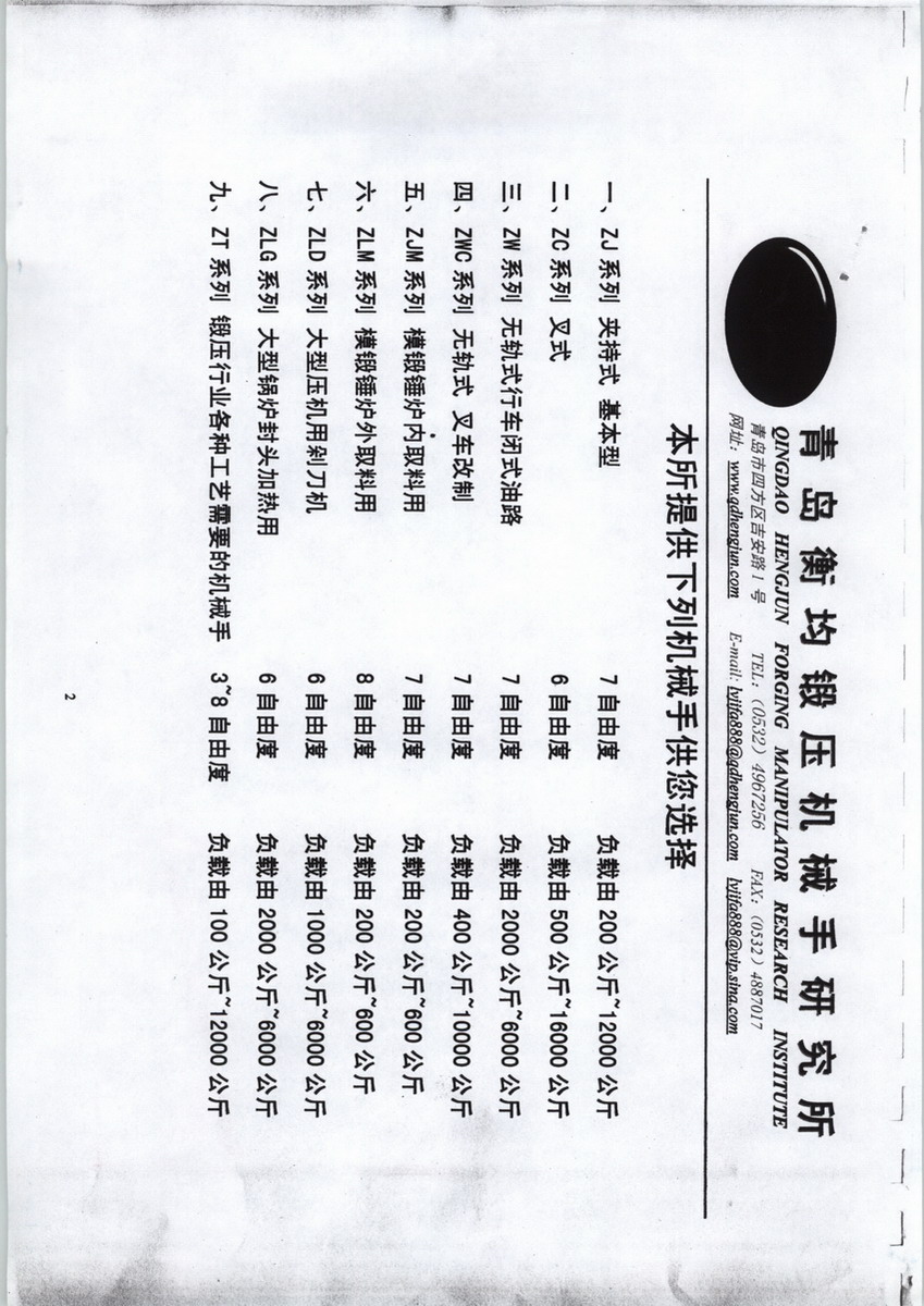本所研制的六大系列装出料机械手,遍布全国各地,得到用户的一致好评,其关键技术是上世纪90年代初我所研制的无绞轴夹头,其特点是:具有体积小,夹持力大和在高温炉内有较长耐热时间等多项优点。本系列装取料机械手是在我国锻压行业中独立发展起来的专业性很强的产品,悬臂长度可设计在4m-5m之间,这对锻压机与装出料机械手的布置很易进行,司机可远离热源。经30多年来的现场使用证明,装出料性能皆可满足众多锻造厂家。
