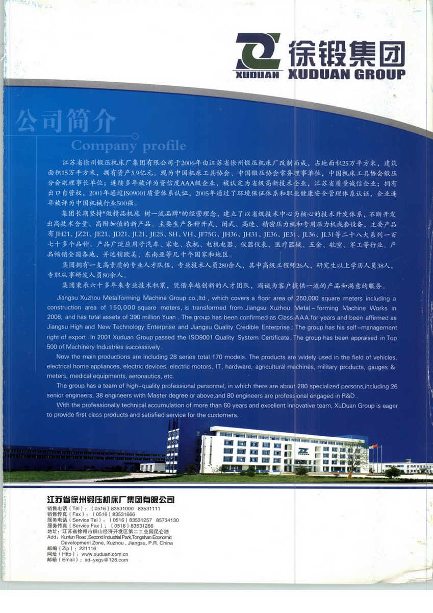 江苏省徐州锻压机床厂集团有限公司始建于1951年,1964年开始批量生产开式机械压力机,并于当年被原机械工业部认定为国家首批机械压力机定点生产企业,1988年被评为国家二级企业,1995年被认定为国有大型工业企业,为中国机床工具工业协会、中国锻压协会常务理事单位,中国机床工具工业协会锻压分会副理事长单位。