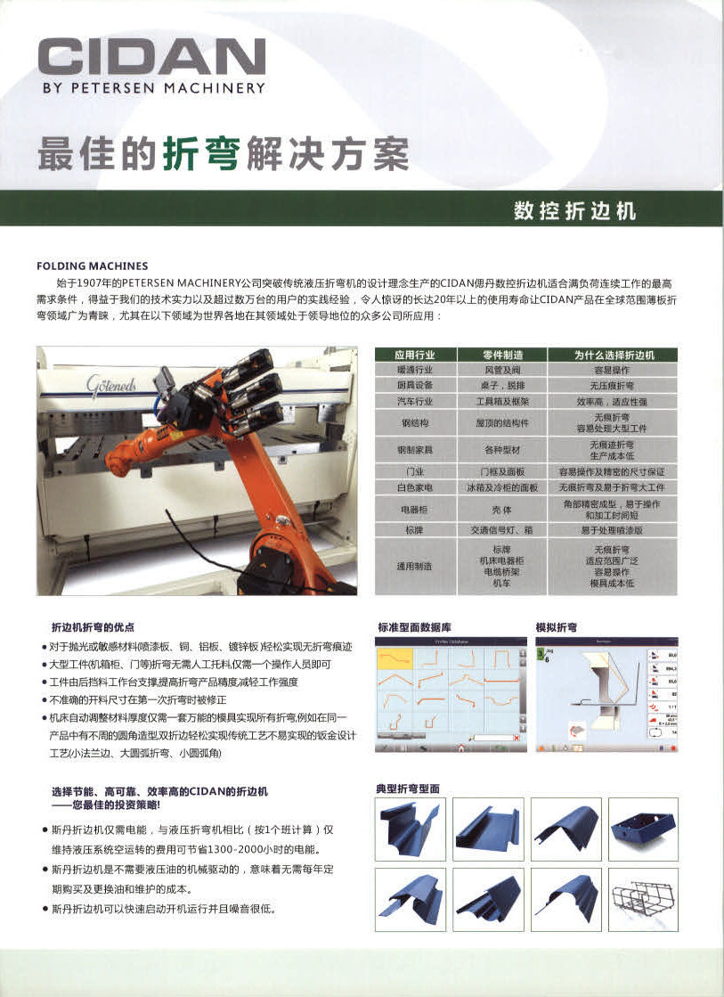 CIDAN Machinery偲丹机械成立于1907年,在钣金机械生产领域历史悠久,口碑极佳。公司的生产基地在瑞典、丹麦和美国,销售网络遍布全球四十多个国家和地区。上海偲丹机械设备贸易有限公司是CIDAN Machinery在中国独资的第一家公司,主要负责中国以及亚洲地区CIDAN品牌的机械设备产品销售及售后服务。主要产品包括全系列数控折边机、精密机械剪板机、开卷、分条生产线等。