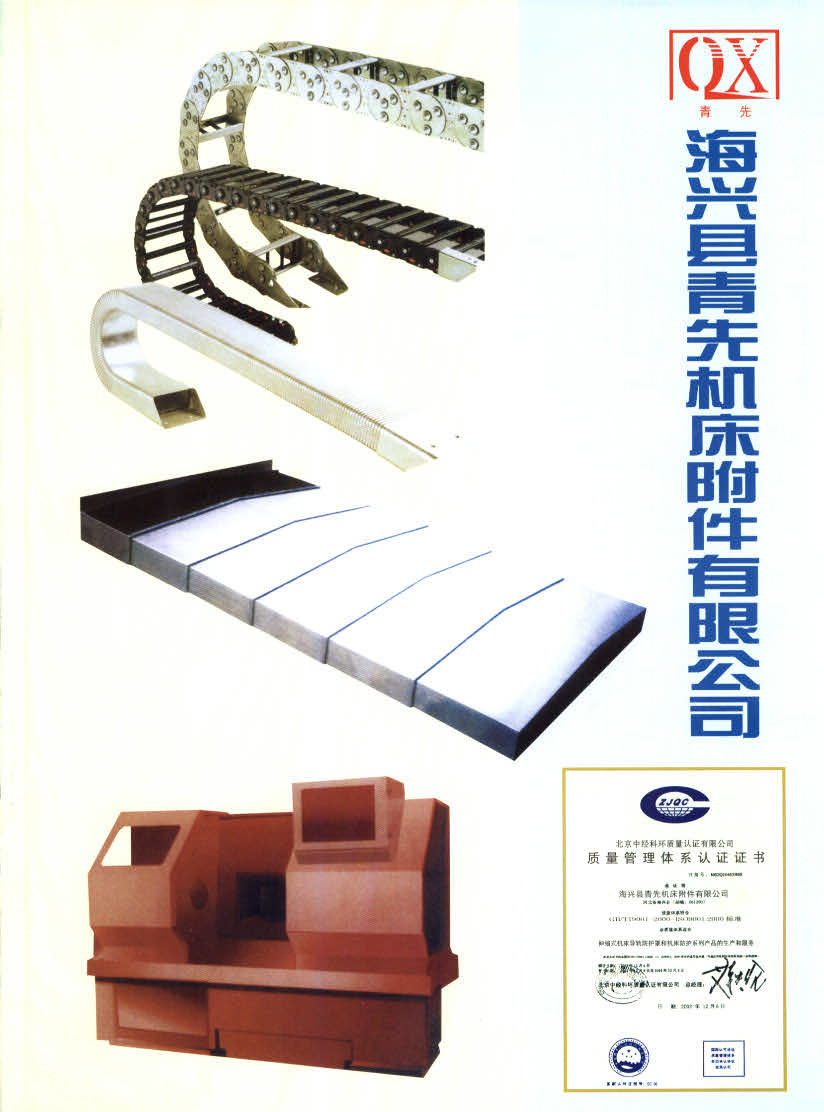 海兴县青先机床附件有限公司创建于1992年,2003年改制为股份有限公司,主要生产数控机床配套部件,产品有导轨防护罩,排屑机,机床外防护,塑料、钢制拖链,各种钣金件,产品遍布全国各地。 我公司依靠科技开发产品,用户遍布全国各地,拥有激光切割机、数控折弯机、数控剪板机、气体保护焊机等一大批国际先进的钣金加工设备。并于2008年通过了ISO9001-2000质量体系认证。 我公司致力于开拓创新、不断改造完善,为用户提供最好、更新的现代化新产品,并通过完善的售后服务来满足您的愿望与需求,欢迎各单位选用我公司生产的系列产品。我们愿与您忠诚合作、共同发展。