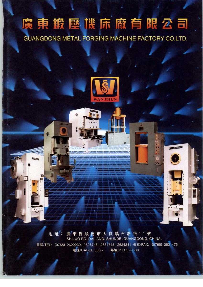 主导产品有高精度伺服控制压力机、高性能机械压力机、油压机和自动转序冲压线,主要型号有:GP2S系列伺服控制闭式双点精密压力机、GDKS系列伺服控制肘杆压式精密压力机、JH21系列开式固定台压力机;JH25系列开式双点压力机;J84系列肘杆式精密压力机;STP(P)系列闭式双点压力机;STPL系列闭式双点压力机;Y系列油压机等。公司产品质量稳定可靠。大型压力机最大吨位可达12000kN,大型油压机最大公称力可达50000kN,高速压力机最高速度可达800次/分钟,精密压力机调整精度可精确到0.01mm。产品大部分处于国内领先或先进水平,有的达到国际先进水平。 公司一直注重科技创新,近10年,通过鉴定的科技成果有10多项,多项填补国内、省内空白;获得国家专利29项,申请发明专利3项;各级科技进步奖20多项;承担国家、省级等各级科技项目30多项;列入国家级、省级重点新产品10多项。 公司的产品质量稳定可靠,经过四十多年的努力,已建立了完善的销售网络。产品以珠江三角洲为中心,辐射全国,并远销售香港、印尼、日本、菲律宾、马来西亚、美国等十多个国家和地区。 公司将按“系统管理、精心制造、优质服务、创造名牌”的企业宗旨,把企业定位于国内一流的锻压设备制造企业,致力于提高锻压行业的核心技术的研究开发能力,拥有自主的知识产权,掌握锻压设备的核心技术,努力缩短与世界先进水平的差距,提高企业及提高国内锻压设备的国际竞争力,做世界品牌的锻压设备。
