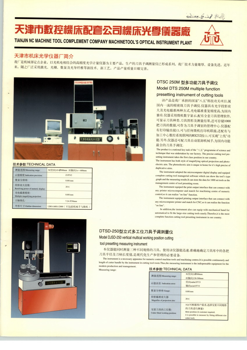 我厂为天津市数控机床配套有限公司机床光学仪器厂,是1969年由天津市机床工具研究所转制的集光、机、电一体的技术密集型企业。本企业拥有先进的技术,精良的设备,完善的测试手段和可靠的质量保证体系。我厂有完整的机械设计加工能力,光学设计制造能力,电气设计试验能力,是国家二级计量单位,国家技术监督局颁发的《制造计量器具许可证》,机械、光学、电气设计工作均由高级工程师主持完成,保证了产品的先进性,质量的可靠性。我厂开发研制的产品分别荣获新产品奖、天津市新产品二等奖、天津市科技进步等奖,天津市优质产品称号等。我们分别参加了国家“七五”和“八五”规划中《多功能数控刀具预调仪的研究》课题的研制工作(国家三级合同)并圆满完成任务。通过组织专家的审评,认为我厂研制的机外刀具预调测量仪达到国际同期先进水平,完全可以替代进口产品,我厂产品为机、光、电一体化产品,技术含量高,具有一定的先进性,产品销售覆盖全国各地部分产品销往欧、亚、美地区,在国内外有一定的盛誉。