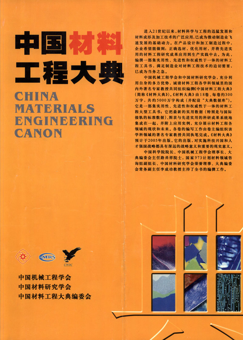 《中国材料工程大典》是关于材料制备和测试、材料成形与加工工程的大型工具书,由中国机械工程学会、中国材料研究学会组织编写,中国科学院路甬祥院长担任编委会主任,师昌绪院士等做顾问, 39位院士、1200余位专家教授共同执笔。《大典》共 26 卷,近 7000 万字,是我国当前规模最大、内容最全面的材料工程工具书。