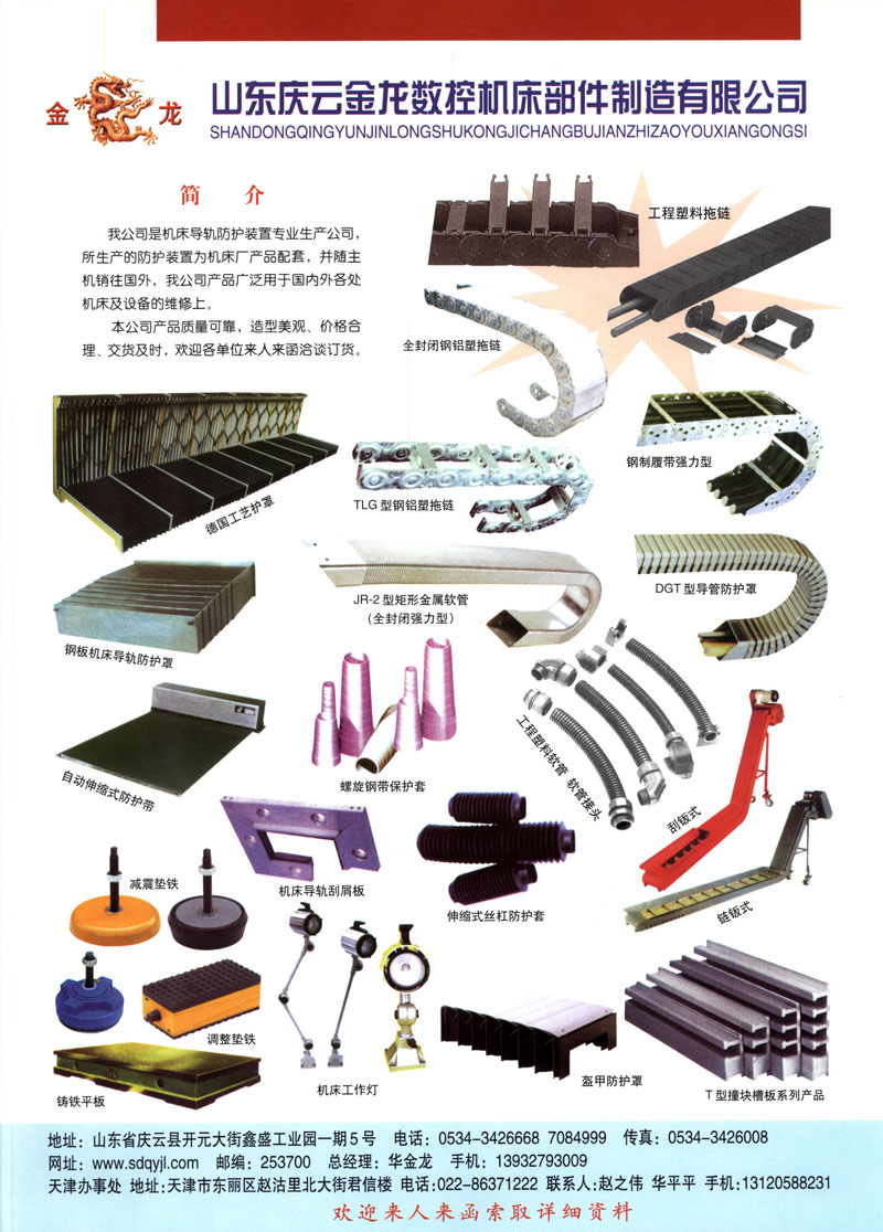 山东庆云金龙数控机床部件制造有限公司,始建于一九七八年,是华北地区最大的机床部件制造 基地,二00五年被评为中国三大机床防护生产厂家之一,同时被中国机械协会明名为: “机床部件专业生产厂家”,并成为“机床总公司会员”单位。