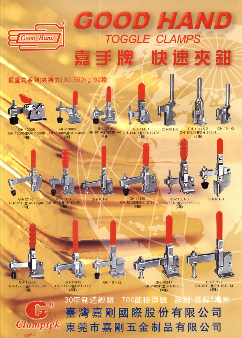 嘉刚的技术研发源於台湾,嘉刚总部位於台湾,生产基地设立於东莞。凭籍强大的产品开发、制造、销售能力,特别是夹具夹持元件领域,获得客户对嘉刚品牌的认同与信赖,嘉刚人坚持不懈的辛勤努力,为中国的工业装备业作出卓越的贡献。1974 年由邱魏聪哲先生创立於台湾。1999 年在东莞厚街镇创建生产工厂。2013 年为扩大生产规模,工厂搬迁至东莞东城桑园工业区新厂区。嘉刚公司不仅生产肘节夹钳,还重点投入开发高精密气油压缸、液压站,並将产品服务線延伸到代理盈锡精密锁定螺母、东培精密轴承、弘旺联轴器及德國Halder精密彈性定位柱塞。