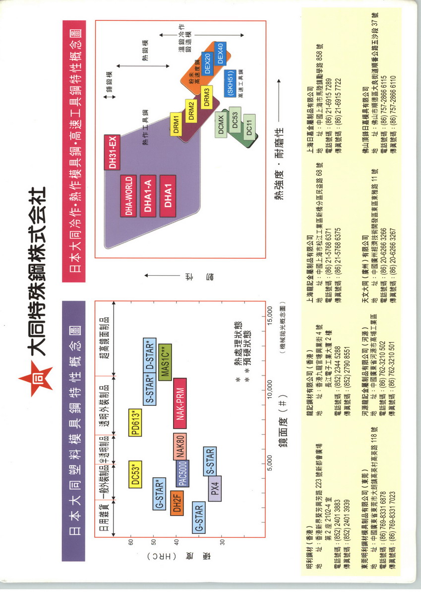日本大同模具钢,世界知名品牌模具钢,作为日本的三大模具钢材制造商之一,日本大同特殊钢株式会社拥有雄厚的技术实力和完善的模具钢材生产线,可以为用户提供各种性能优异的模具钢产品,满足客户需求。 日本大同特殊钢株式会社的英文名称为Daido Steel Co.,Ltd.,1916年设立电气制钢所(株)开始生产合金钢和工具钢,1921年成立大同制钢株式会社。1916年工厂生产采用的1.5T Heroult型电弧炉,是日本最古老的一种炼钢炉,已于1988年由美国金属学会(ASM)命名为世界上第59个ASM历史性标志(列日本第二)。大同特殊钢经过90多年的发展,现在在特殊钢钢材,电子材料,汽车零部件,产业机器零部件,工程设备和新材料等多个领域日益显示出其强大的实力,它在日本拥有17个设备完善的工厂和一个技术研究开发中心。