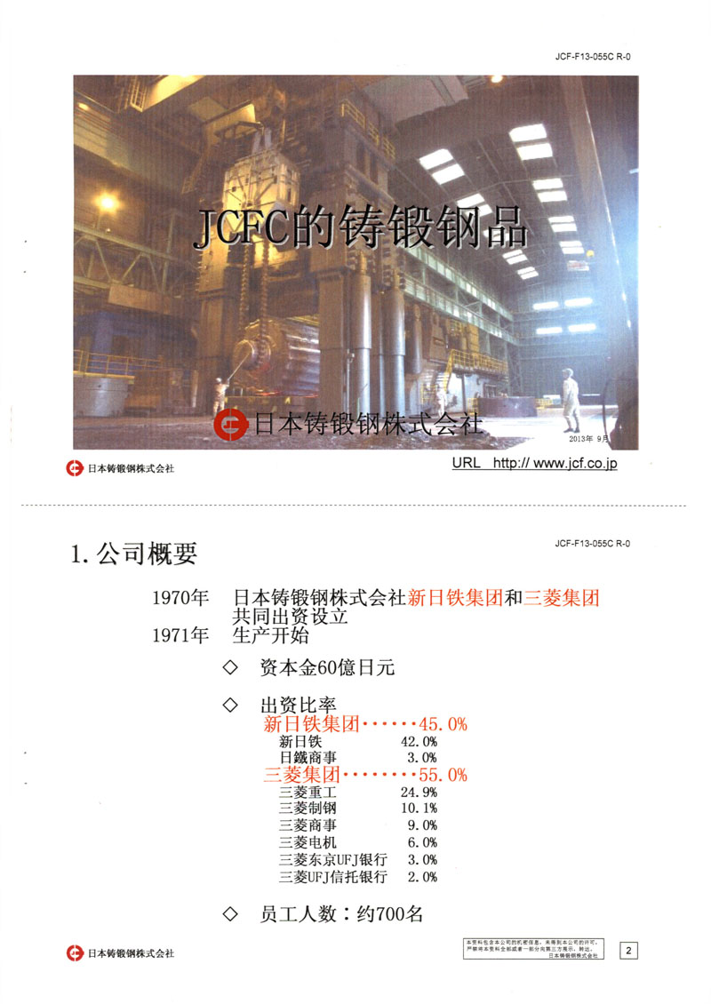 日本铸锻钢株式会社(通称:JCFC),主要产品是大型铸锻件(各种发电成套设备,各种产业机械,大型船舶零部件等)的制造、销售