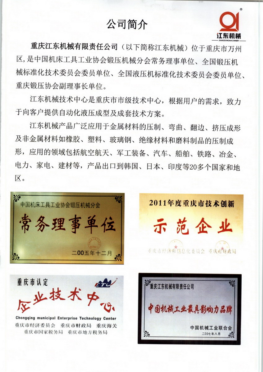 重庆江东机械有限责任公司(以下简称为江东机械)通过七十年的发展,已经成为中国西部规模最大、综合实力最强的专业液压成形设备制造企业。 公司占地458亩,总资产超过3亿元,拥有现代化标准厂房7万余平方米,员工1000余人,拥有各类专业技术人员150余人,其中国家级专家2人、市级专家4名、高级工程师6名;在机械设计方面拥有国家级专家1名,市级专家1名,高级工程师2名;在液压设计方面拥有国家级专家1名,市级专家1名,高级工程师2名;电气设计方面拥有市级专家2名,高级工程师2名;另外,江东机械拥有各类专业加工设备200余台(套),完全具备为用户提供5000KN-60000KN的各种大型、快速、精密、专用的全自动液压机及成套生产线的综合实力,月平均制造能力达到100余台,年创产值能力达到4亿元以上。