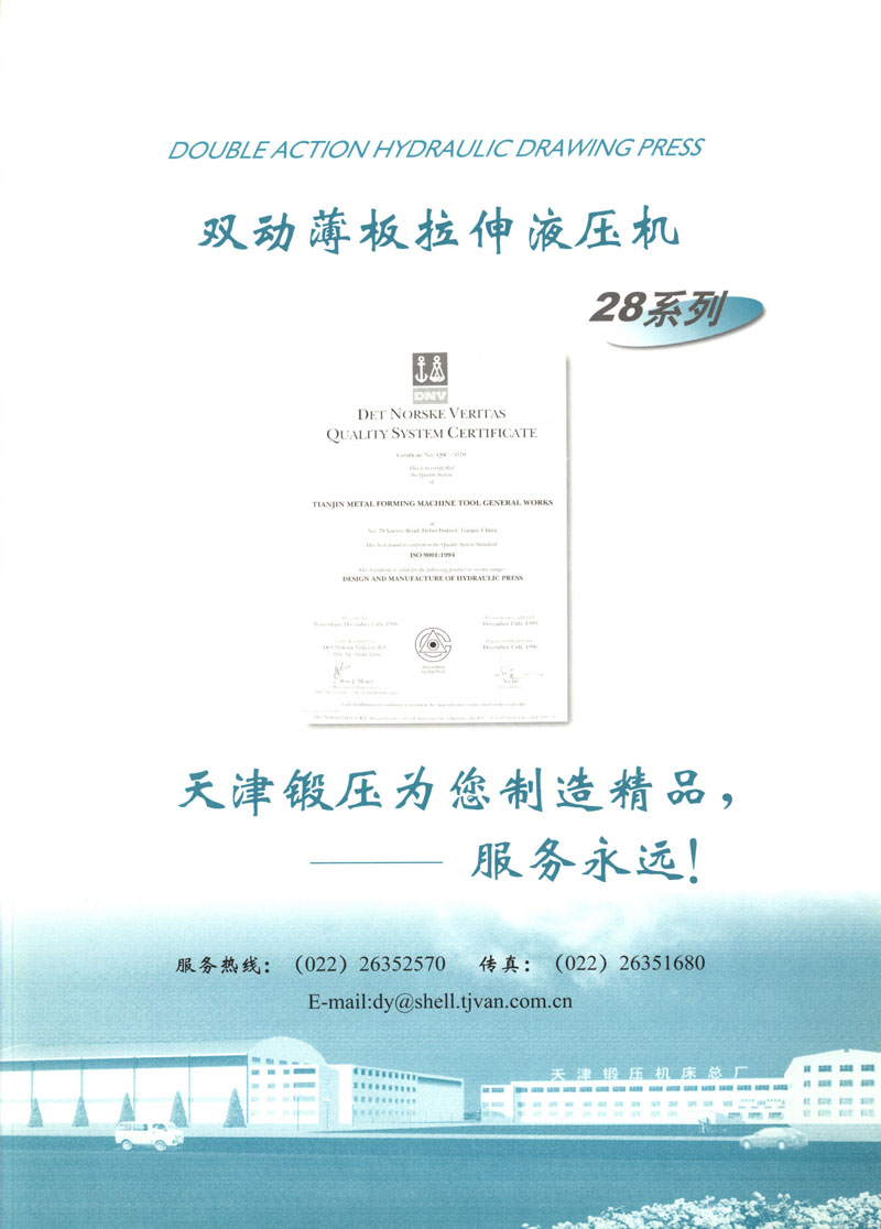 天津市锻压机床总厂是我国起步最早的企业,现有固定资产2.4亿元各类专业技术人员480人,是机械部大型骨干企业。自我厂自行设计国内第一台液压机,开创了我国中小型液压机生产历史以来,目前拥有26个系列,300余品种,产品从80KN至5000KN,以形成年产1200台各类液压机的生产能力,居国内同行业之首。1983年YT32-315四柱液压机获国家银牌,1990年YT32-630/1030双动力拉伸液压机一举荣获同行业唯一的国家金奖另有部优产品3项,市优产品5项。产品广泛适用于汽车制造、粉末冶金、金属冷挤、轻工家电、化工机戒、航空航天、模具磨料、机戒制造等行业,被国家指定为替代进口产品,行销全国,产品出口到日本、荷兰、东南亚等20多个地区和国家、市场占有率居全国同行业第一。