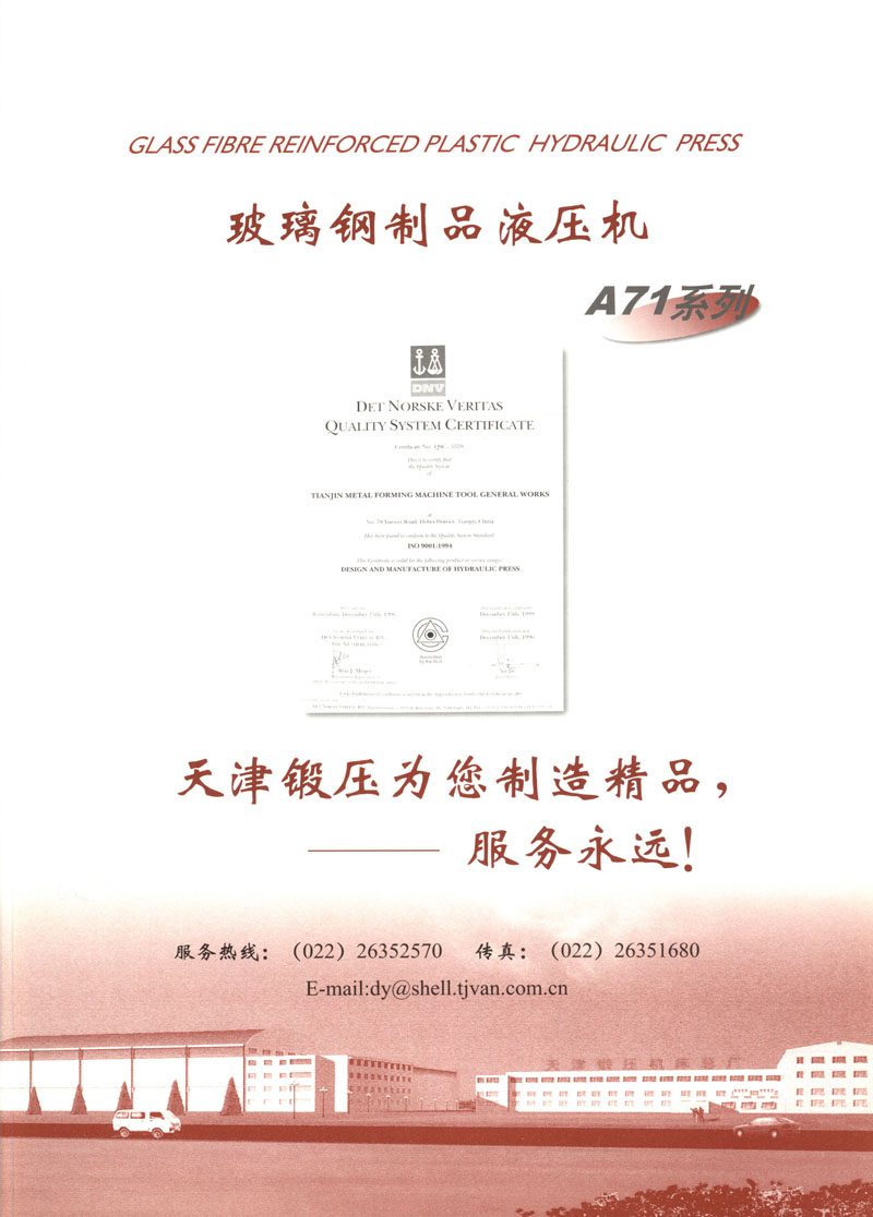 天津市锻压机床总厂是我国起步最早的企业,现有固定资产2.4亿元各类专业技术人员480人,是机械部大型骨干企业。自我厂自行设计国内第一台液压机,开创了我国中小型液压机生产历史以来,目前拥有26个系列,300余品种,产品从80KN至5000KN,以形成年产1200台各类液压机的生产能力,居国内同行业之首。1983年YT32-315四柱液压机获国家银牌,1990年YT32-630/1030双动力拉伸液压机一举荣获同行业唯一的国家金奖另有部优产品3项,市优产品5项。产品广泛适用于汽车制造、粉末冶金、金属冷挤、轻工家电、化工机戒、航空航天、模具磨料、机戒制造等行业,被国家指定为替代进口产品,行销全国,产品出口到日本、荷兰、东南亚等20多个地区和国家、市场占有率居全国同行业第一。