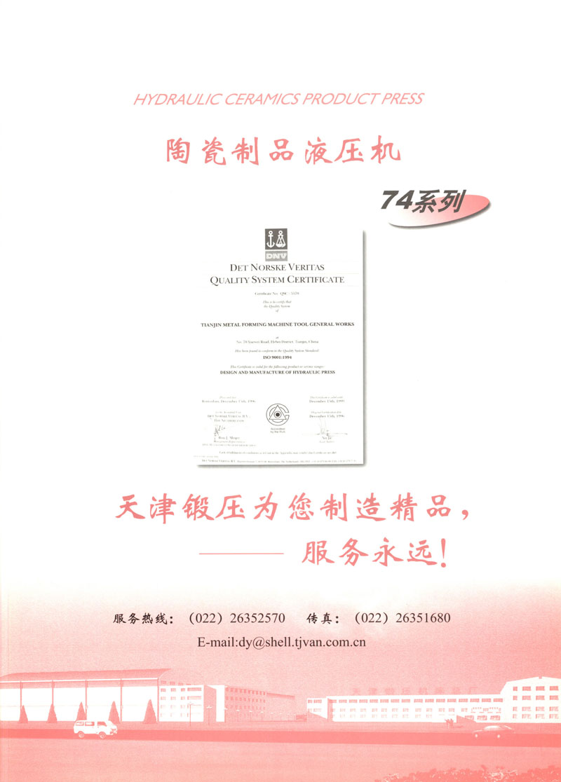 天津市锻压机床总厂是我国起步最早的企业,现有固定资产2.4亿元各类专业技术人员480人,是机械部大型骨干企业。自我厂自行设计国内第一台液压机,开创了我国中小型液压机生产历史以来,目前拥有26个系列,300余品种,产品从80KN至5000KN,以形成年产1200台各类液压机的生产能力,居国内同行业之首。1983年YT32-315四柱液压机获国家银牌,1990年YT32-630/1030双动力拉伸液压机一举荣获同行业唯一的国家金奖另有部优产品3项,市优产品5项。产品广泛适用于汽车制造、粉末冶金、金属冷挤、轻工家电、化工机戒、航空航天、模具磨料、机戒制造等行业,被国家指定为替代进口产品,行销全国,产品出口到日本、荷兰、东南亚等20多个地区和国家、市场占有率居全国同行业第一。