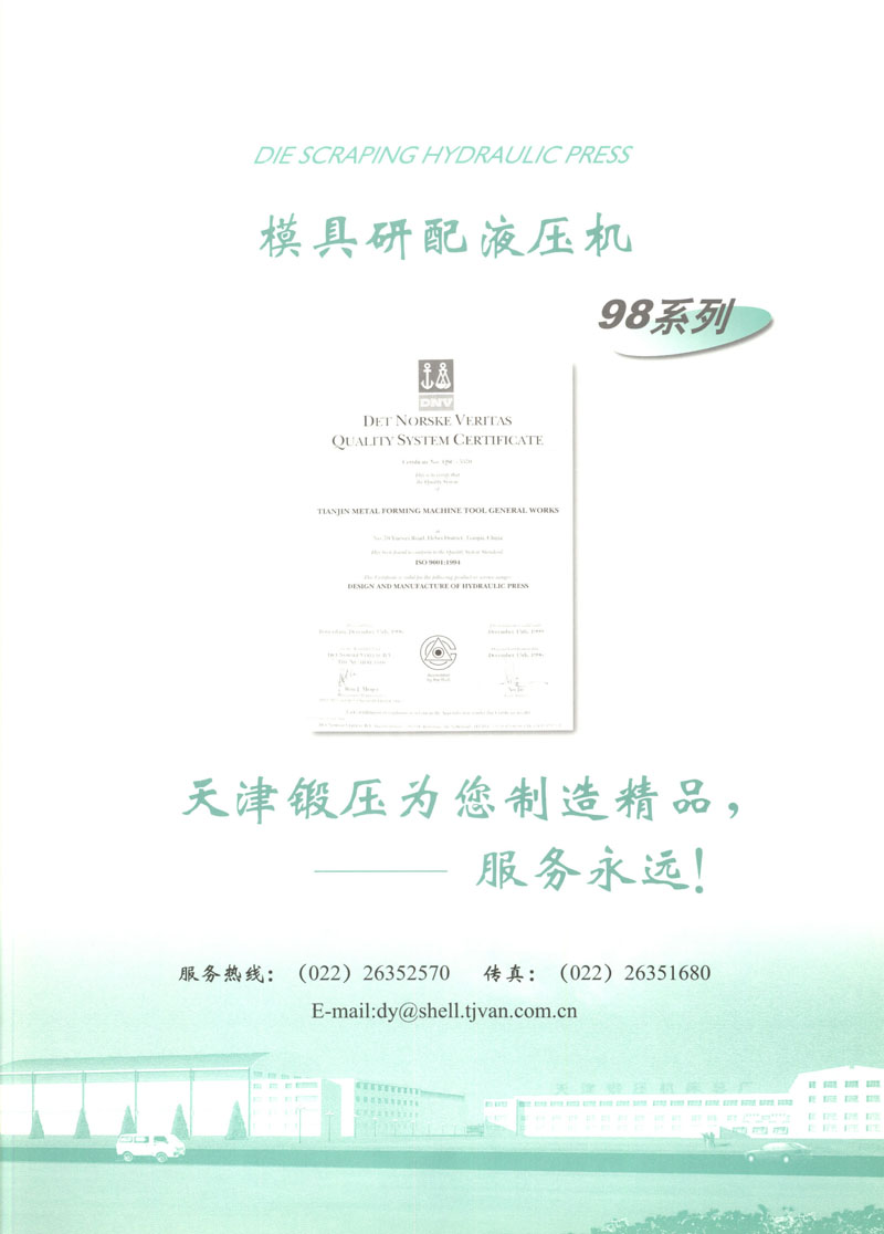 天津市锻压机床总厂是我国起步最早的企业,现有固定资产2.4亿元各类专业技术人员480人,是机械部大型骨干企业。自我厂自行设计国内第一台液压机,开创了我国中小型液压机生产历史以来,目前拥有26个系列,300余品种,产品从80KN至5000KN,以形成年产1200台各类液压机的生产能力,居国内同行业之首。1983年YT32-315四柱液压机获国家银牌,1990年YT32-630/1030双动力拉伸液压机一举荣获同行业唯一的国家金奖另有部优产品3项,市优产品5项。产品广泛适用于汽车制造、粉末冶金、金属冷挤、轻工家电、化工机戒、航空航天、模具磨料、机戒制造等行业,被国家指定为替代进口产品,行销全国,产品出口到日本、荷兰、东南亚等20多个地区和国家、市场占有率居全国同行业第一。