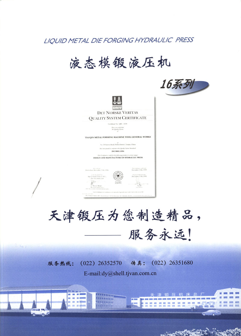 天津市锻压机床总厂是我国起步最早的企业,现有固定资产2.4亿元各类专业技术人员480人,是机械部大型骨干企业。自我厂自行设计国内第一台液压机,开创了我国中小型液压机生产历史以来,目前拥有26个系列,300余品种,产品从80KN至5000KN,以形成年产1200台各类液压机的生产能力,居国内同行业之首。1983年YT32-315四柱液压机获国家银牌,1990年YT32-630/1030双动力拉伸液压机一举荣获同行业唯一的国家金奖另有部优产品3项,市优产品5项。产品广泛适用于汽车制造、粉末冶金、金属冷挤、轻工家电、化工机戒、航空航天、模具磨料、机戒制造等行业,被国家指定为替代进口产品,行销全国,产品出口到日本、荷兰、东南亚等20多个地区和国家、市场占有率居全国同行业第一。