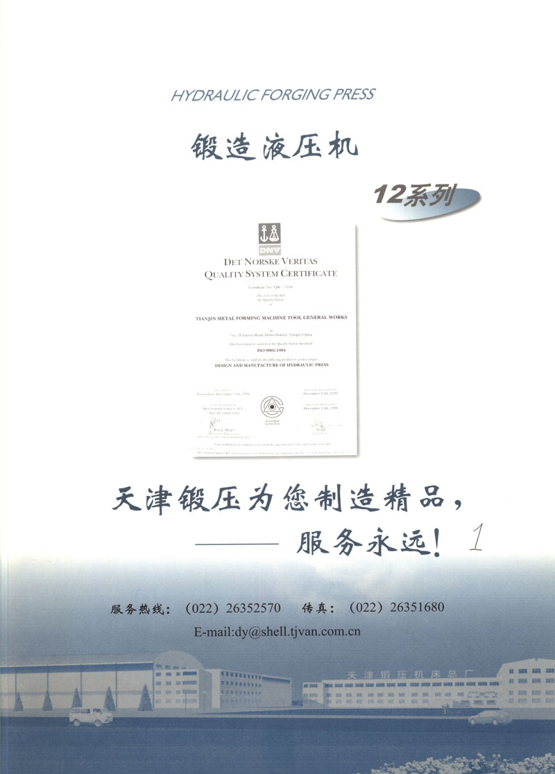 天津市锻压机床总厂是我国起步最早的企业,现有固定资产2.4亿元各类专业技术人员480人,是机械部大型骨干企业。自我厂自行设计国内第一台液压机,开创了我国中小型液压机生产历史以来,目前拥有26个系列,300余品种,产品从80KN至5000KN,以形成年产1200台各类液压机的生产能力,居国内同行业之首。1983年YT32-315四柱液压机获国家银牌,1990年YT32-630/1030双动力拉伸液压机一举荣获同行业唯一的国家金奖另有部优产品3项,市优产品5项。产品广泛适用于汽车制造、粉末冶金、金属冷挤、轻工家电、化工机戒、航空航天、模具磨料、机戒制造等行业,被国家指定为替代进口产品,行销全国,产品出口到日本、荷兰、东南亚等20多个地区和国家、市场占有率居全国同行业第一。