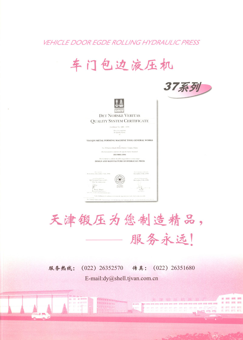 天津市锻压机床总厂是我国起步最早的企业,现有固定资产2.4亿元各类专业技术人员480人,是机械部大型骨干企业。自我厂自行设计国内第一台液压机,开创了我国中小型液压机生产历史以来,目前拥有26个系列,300余品种,产品从80KN至5000KN,以形成年产1200台各类液压机的生产能力,居国内同行业之首。1983年YT32-315四柱液压机获国家银牌,1990年YT32-630/1030双动力拉伸液压机一举荣获同行业唯一的国家金奖另有部优产品3项,市优产品5项。产品广泛适用于汽车制造、粉末冶金、金属冷挤、轻工家电、化工机戒、航空航天、模具磨料、机戒制造等行业,被国家指定为替代进口产品,行销全国,产品出口到日本、荷兰、东南亚等20多个地区和国家、市场占有率居全国同行业第一。