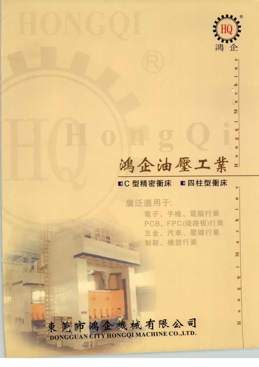 东莞市鸿企机械有限公司成立于1995年,本公司是集研发、生产、销售油压机为主的企业,所使用的液压配件均为进口,电器配件也均为日本(三菱)、德国(西门子)、意大利、法国及台湾的各大供应商提供(供客户选择),所生产的产品有3-200吨精密油压冲床,3-1000吨普通油压机,机器的外型、规格及性能可根据用户需要定制。EP精密冲床及C型单工位、双工位精密冲床可加工:PET、PCB、FPC、保护膜、双面胶、铜铝薄等各种电子材料,可冲切全断及半断,精度可控制在±0.01mm,适用于电子、汽车、家电、五金、制鞋、体育、橡塑行业的零配件加工。普通油压机适用于各种五金产品的定型、拉伸、汽车零配件类装配、压印成型等,机器压力稳定、速度快、节能、环保,同时本公司提供各种专机的特殊设计、设备维修、零配件供应等服务。