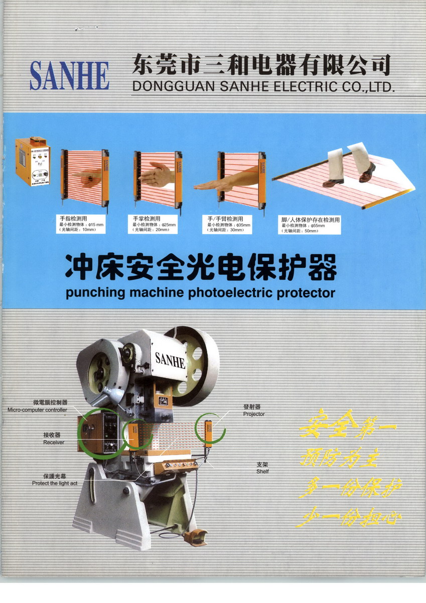三和电器成立于1997年,十年来全心投入、致力于冲压机的光电安全防护工作。从引进技术到自主研发,三和人秉着继往开来的精神,不断完善创新。从原来的单一品种到目前的四大系列(RA-D1、RA-D2、RA-D3、RA-D4)共36个规格。不单单解决了不同型号、不同规格的气动压力机(冲床)、剪板机、液压机、注塑机、铝压铸机、烫金机等机种危险作业的安全防护工作;还特别针对目前国内老式拉杆惯性冲床研发了RA-D2、RA-D3等型号。从而为您营造出一个更安全的生产环境!