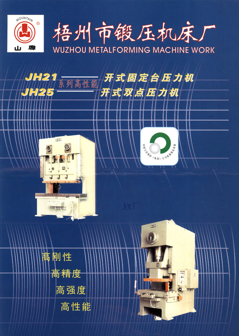 梧州市锻压机床厂属国家中型一级企业,是广西目前最大的机械压力机制造厂家。近年来,先后被评为自治区先进企业,广西科技开发百强企业,广西百名优秀纳税人,广西“重合同,守信用”企业,国家一级计量企业,银行信用 “AA ”级企业。 企业已通过ISO9001:2000质量体系认证,有30多年生产锻压设备经验。主要生产JH21系列、JH25系列压力机,规格从63KN-3150KN。年产各种型号压力机1000台,年产值3000万元。企业从1999年以来平均年销售收入3002万元,利税16%以上。特别是JH21、JH25系列1600KN以上大型、高速、数控压力机,利税率达25%。我厂占地35440平方米,厂房面积24688平方米,拥有国内行业先进水平的机床装备、精密加工、计量检测设备,主要生产设备拥有量为270台套,年生产压力机能力为1000多台套。