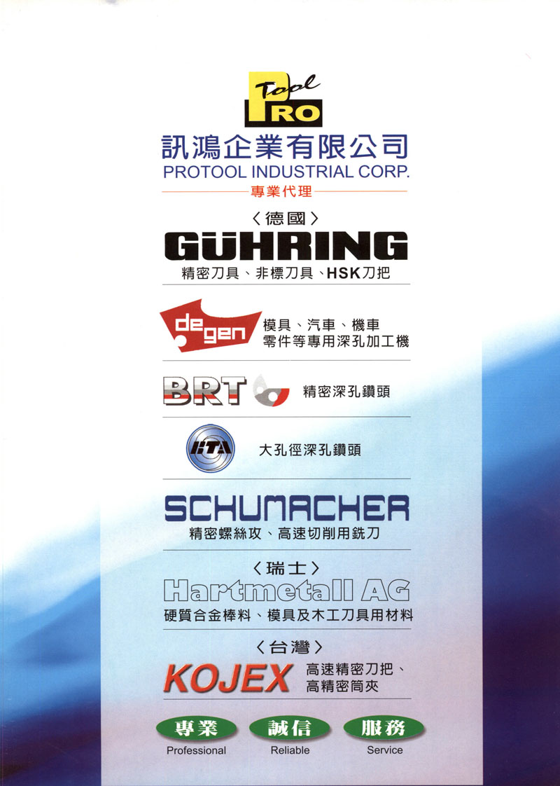 讯鸿公司是由总经理郑文照创立,专业背景备受推崇,不但销售能力受肯定,并可提供完善的售后服务。目前该公司主要代理品包括德国BRT精密深孔钻头及德国RINECK模具高转速精密刀把,及德国知名切削刀具等。