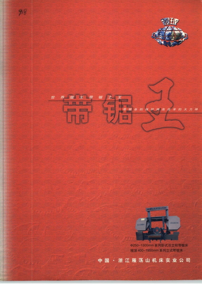 浙江省雁荡山机床有限公司创办于1987年,专业从事带锯床、带锯条的研究和生产,公司现有员工500人,下设总厂、铸造分厂、钣金分厂、磨齿机分厂、焊接机分厂,全国各省共有40个办事处,总厂占地面积13800m2,建筑面积10000m2,下设:金工车间、装配车间、锯条车间、钣金车间、喷漆车间、成品锯带焊接车间,主要产品:卧式、立式及卧立旋转三大类30种规格70余种机型,年生产能力3000台套以上,锯条200万米。