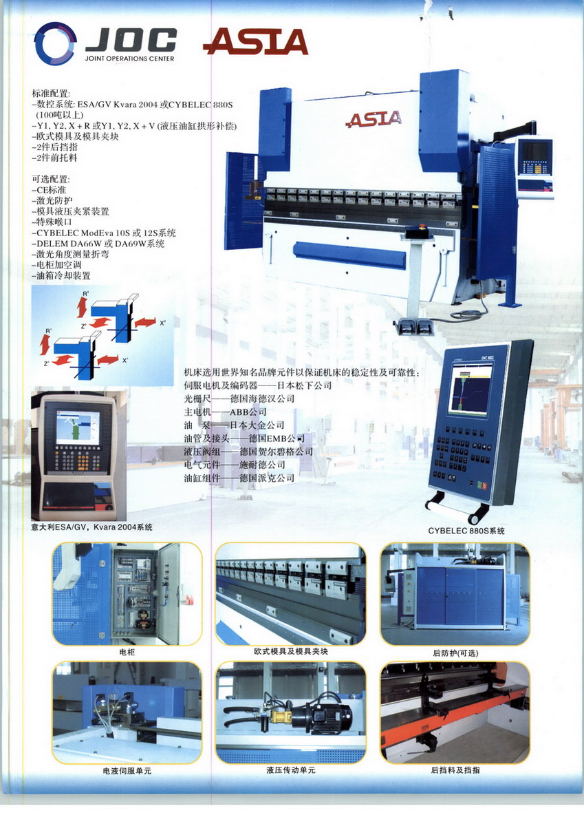 昆山亚细亚机械有限公司于1999年开始与上海其它厂家合作生产“AS”数控剪板机、数控折弯机、数控冲床已累计产量达500台,取得了成功。现亚细亚公司看好中国市场,在昆山建设的大型厂房已竣工(一期工程),开始生产以公司名称“ASIA”为品牌的系列数控剪板机、数控折弯机和数控冲床。