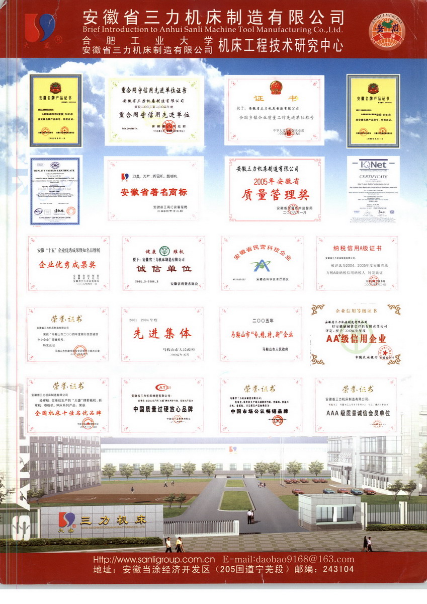 安徽省三力机床制造股份有限公司,属安徽省名牌、免检产品生产企业,安徽省民营科技企业,马鞍山市“专、精、特、新”企业,马鞍山市下岗失业职工再就业基地,介于南京、芜湖之间,坐落在著名的钢城马鞍山市,丰富的钢铁资源为公司的发展提供了得天独厚的优势。公司占地面积108000平方米。