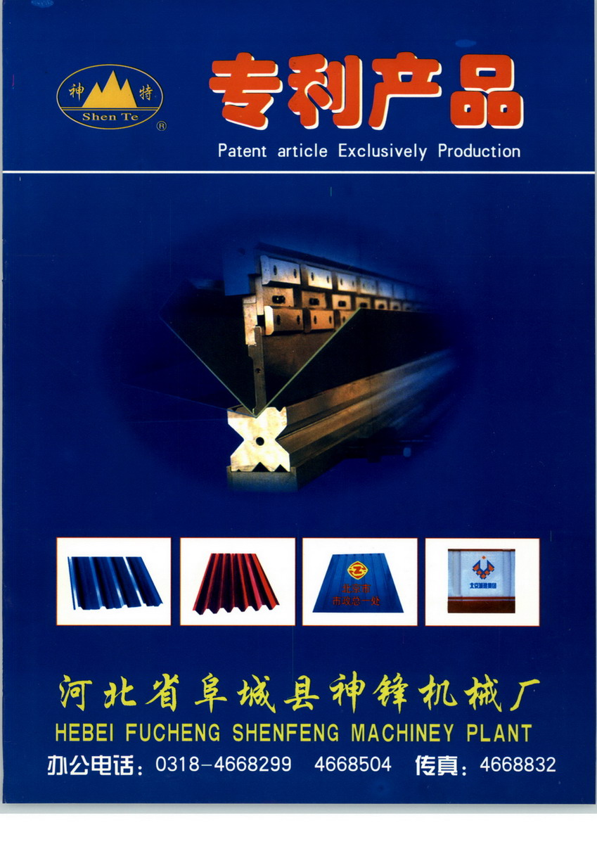 神锋机械厂创建于一九八五年,座落在京南卧牛古城阜城,县城内西安南大街278号。主要设计生产以“神特”牌为商标的,8米以内的液压摆式、闸式剪板机生产:500吨以内的折弯机床及各种折剪刀模具。13米×3.15以内的龙门刨、单臂刨、铣镗床、端面铣、立镗床,集设计生产、销售、服务一条龙,具有强大的生产加工设备、和雄厚的技术力量,特殊规格可根据用户设计定做,交货及时。