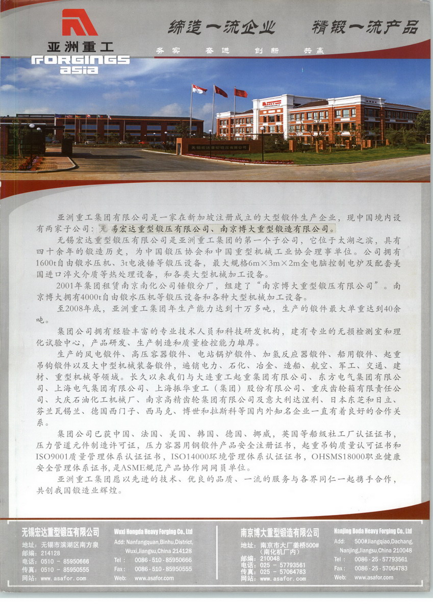 无锡宏达重型锻压有限公司是亚洲重工集团的第一个子公司,它位于太湖之滨,具有四十余年的锻造历史,为中国锻压协会和中国重机协会理事单位。公司拥有1600t自由锻水压机、3t电液锤等锻压设备,最大规格6m×3m×2m全电脑控制电炉及配套美国进口淬火介质等热处理设备,和各类大型机械加工设备。