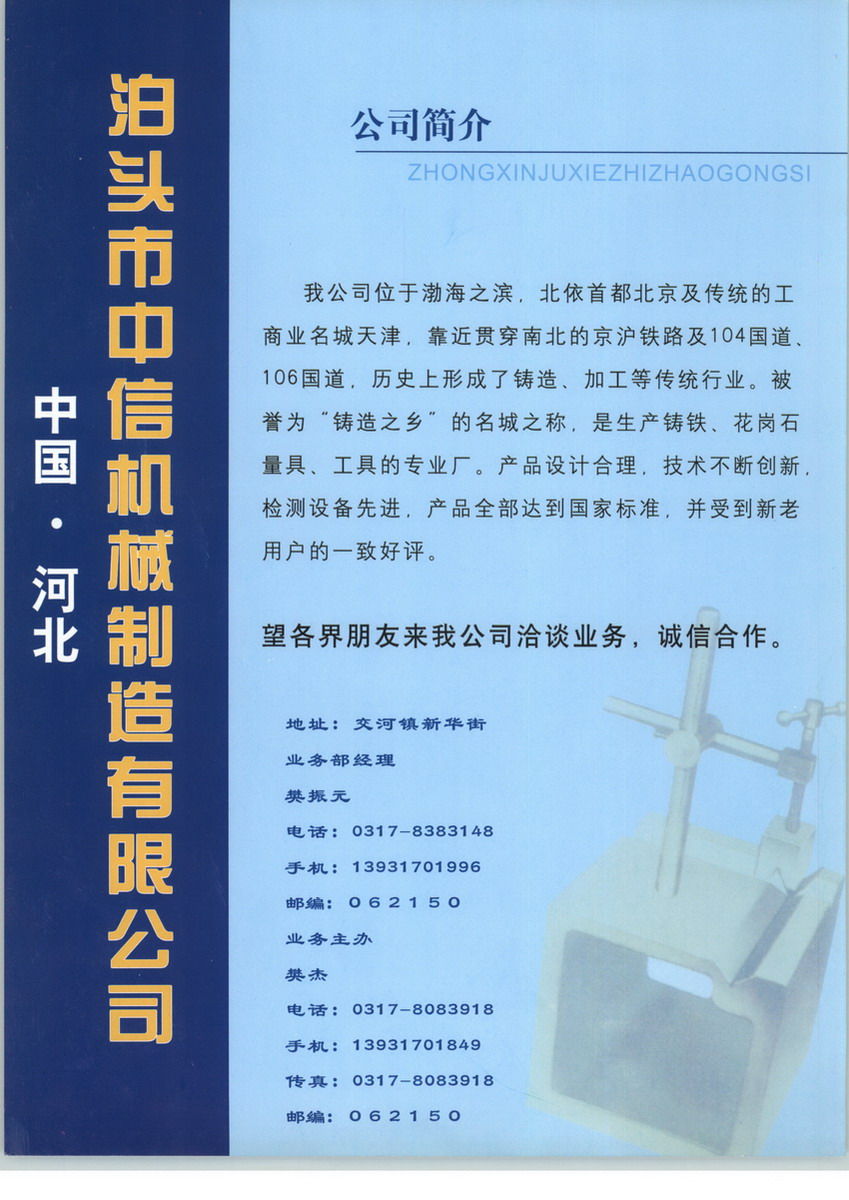 本公司技术力量雄厚,设备一流,工艺先进合理,管理规范,完全能满足不同用户的要求,我们公司的经营理念是:品质重于泰山、工作求实、产品求精。我们的宗旨是:以技术实力赢得市场,以诚实守信赢得用户。泊头市中信机械制造有限责任公司总经理樊文涛欢迎各位领导、各届朋友光临指导,洽谈合作。