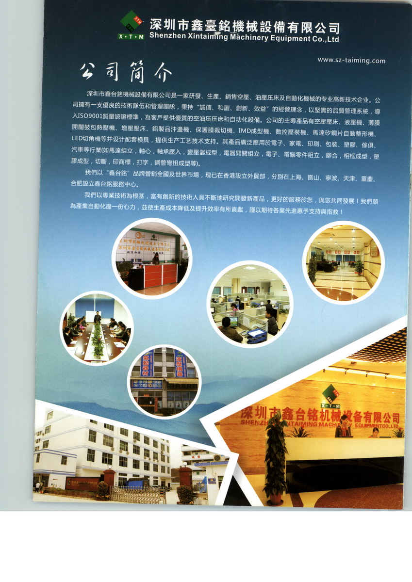 鑫台铭的产品一直专注于智能压装装备领域,随着几年来大力发展与研发,开发出有自己的核心技术且在国内处于先进地位的产品:液压机,精密伺服电子压力机,数控液压压装机, IMD热压成型机,气动元件,全自动手机辅料贴标机(自动化环形线),压铸周边自动化设备,汽车P档测试机,一体式电感全自动成型机,通用四轴、六轴机床工业机器人等标准及非标机械,并可配套模具,提供生产技术支持。产品广泛应用于电子、电器、汽配、机电、压铸、热压整型、智能化压装、科研单位等行业。